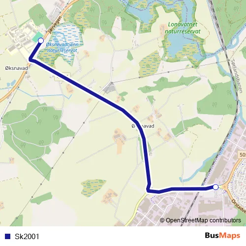 The first stop of the Sk2001 bus route is Øksnevad vgs. and the last stop is Øksnavadporten stasjon. Sk2001 is operational during på hverdager.