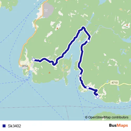 The first stop of the Sk3402 bus route is Jelsa skule and the last stop is Landsnes. Sk3402 is operational during på hverdager.