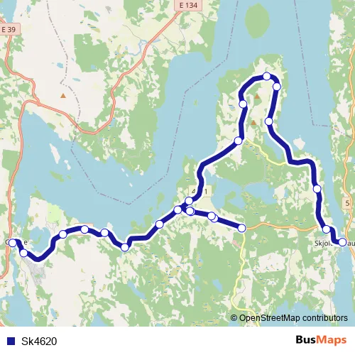 The first stop of the Sk4620 bus route is Grinde skule and the last stop is Skjoldastraumen bru. Sk4620 is operational during på hverdager.