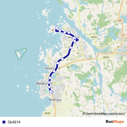 The first stop of the Sk4914 bus route is Åkra ungdomsskole and the last stop is Salvøy. Sk4914 is operational during på hverdager.