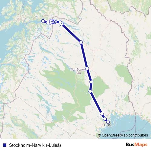 The first stop of the Stockholm-Narvik (-Luleå) rail route is Luleå Centralstation and the last stop is Narvik stasjon. Stockholm-Narvik (-Luleå) (Stockholm-Narvik (-Luleå)) is operational during hver dag.