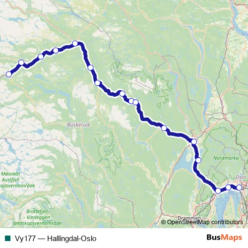 The first stop of the Vy177 bus route is Oslo bussterminal and the last stop is Geilo stasjon. Vy177 (Hallingdal-Oslo) is operational during hver dag.