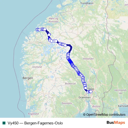 The first stop of the Vy450 bus route is Beitostølen and the last stop is Oslo bussterminal. Vy450 (Bergen-Fagernes-Oslo) is operational during hver dag.