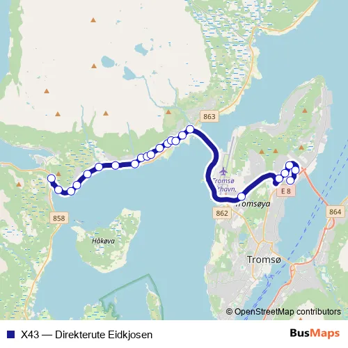 The first stop of the X43 bus route is Eidkjosen and the last stop is Breivika. X43 (Direkterute Eidkjosen) is operational during på hverdager.