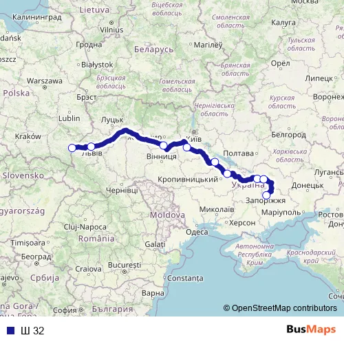The first stop of the Ш 32 rail route is Przemyśl Główny and the last stop is Запоріжжя 1. Ш 32 is operational during codziennie.