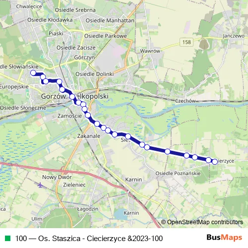 The first stop of the 100 bus route is Os. Staszica and the last stop is Ciecierzyce. 100 (Os. Staszica - Ciecierzyce &2023-100) is operational during w dni robocze.