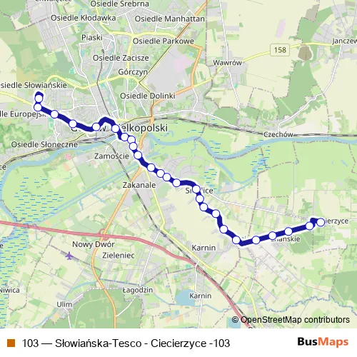 The first stop of the 103 bus route is Słowiańska and the last stop is Ciecierzyce. 103 (Słowiańska-Tesco - Ciecierzyce -103) is operational during w dni robocze.