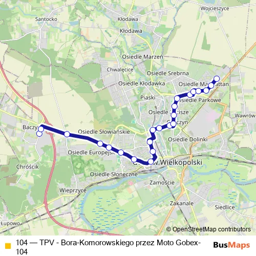 The first stop of the 104 bus route is Tpv and the last stop is Bora-Komorowskiego. 104 (TPV - Bora-Komorowskiego przez Moto Gobex-104) is operational during codziennie.