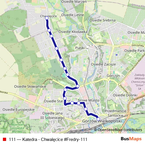 The first stop of the 111 bus route is Katedra and the last stop is Chwalęcice. 111 (Katedra - Chwalęcice #Fredry-111) is operational during codziennie.