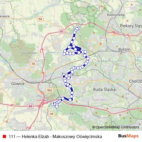 The first stop of the 111 bus route is Helenka Elzab and the last stop is Makoszowy Oświęcimska. 111 (Helenka Elzab - Makoszowy Oświęcimska) is operational during codziennie.
