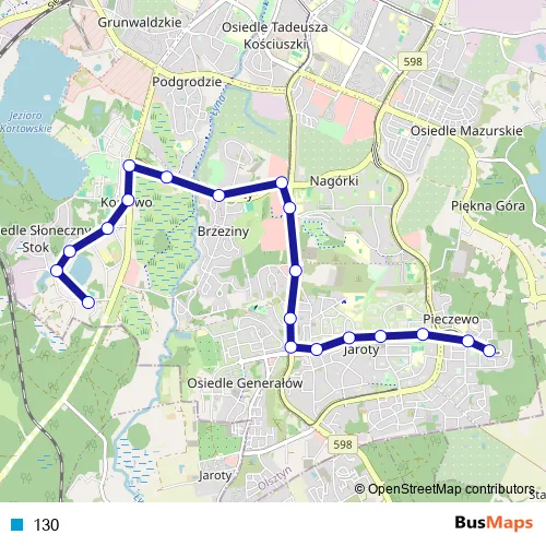 The first stop of the 130 bus route is Pieczewo (Wilczyńskiego) and the last stop is Stary Dwór (Słoneczna). 130 is operational during codziennie.