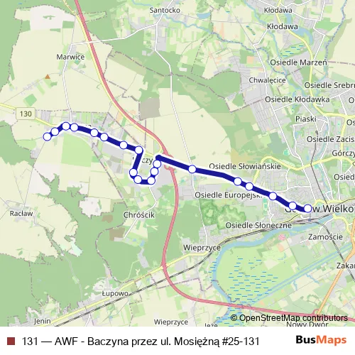 The first stop of the 131 bus route is Awf and the last stop is Baczyna. 131 (AWF - Baczyna przez ul. Mosiężną #25-131) is operational during codziennie.