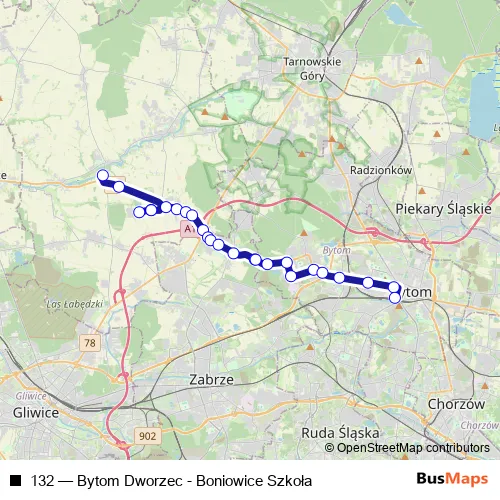 The first stop of the 132 bus route is Boniowice Szkoła and the last stop is Bytom Dworzec. 132 (Bytom Dworzec - Boniowice Szkoła) is operational during codziennie.