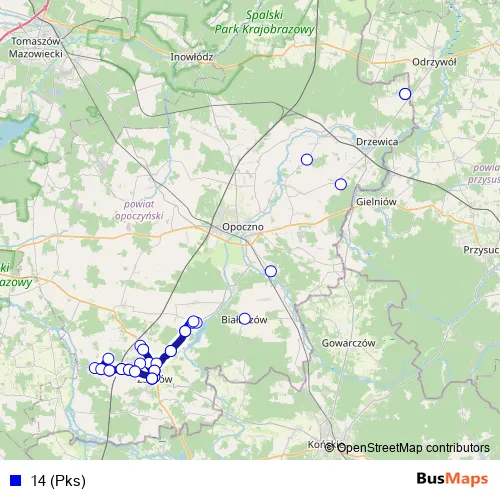 The first stop of the 14 (Pks) bus route is Żarnów ul.Przedborska (Szkoła) and the last stop is Żarnów ul.Przedborska (Szkoła). 14 (Pks) is operational during w dni robocze.