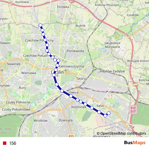 The first stop of the 156 trolleybus route is Felin and the last stop is Choiny. 156 is operational during codziennie.