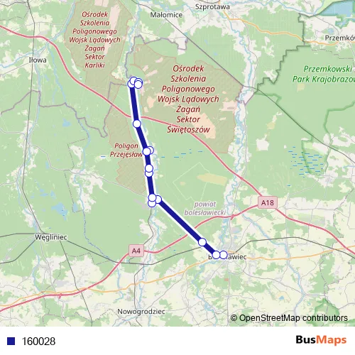 The first stop of the 160028 bus route is Boleslawiec, ul. Wesola d.a. and the last stop is Swietoszow, Sztabowa. 160028 is operational during w dni robocze.