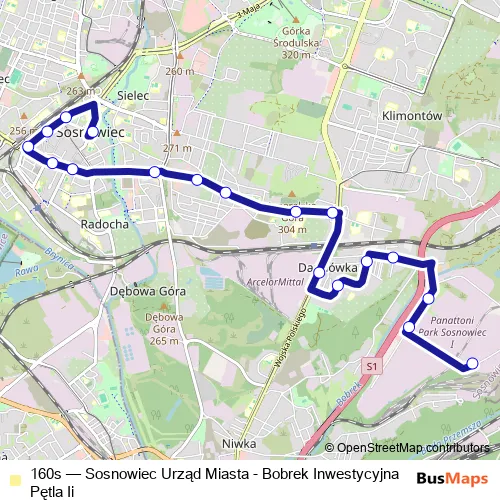 The first stop of the 160s bus route is Bobrek Inwestycyjna Pętla Ii and the last stop is Sosnowiec Urząd Miasta. 160s (Sosnowiec Urząd Miasta - Bobrek Inwestycyjna Pętla Ii) is operational during codziennie.