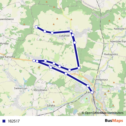 The first stop of the 162517 bus route is Henrykow Lubanski V / Cis and the last stop is Luban ul. Szarych Szeregów Da. 162517 is operational during codziennie.