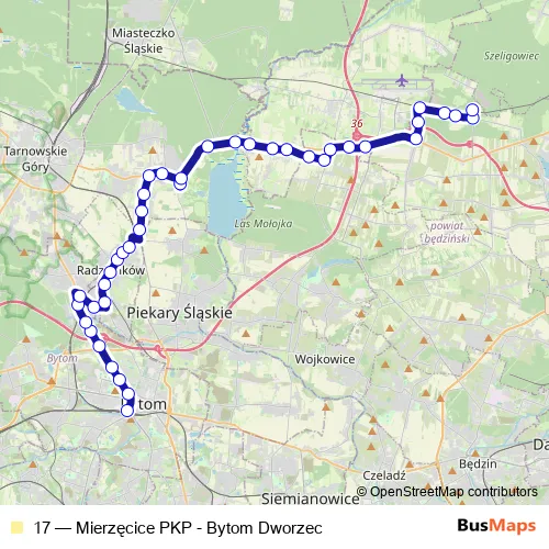 The first stop of the 17 bus route is Bytom Dworzec and the last stop is Mierzęcice Pkp. 17 (Mierzęcice PKP - Bytom Dworzec) is operational during codziennie.