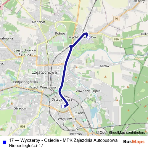 Bus 17 - Wyczerpy - Osiedle - MPK Zajezdnia Autobusowa Niepodległości-17 in Czestochowa: Stops & Timetable