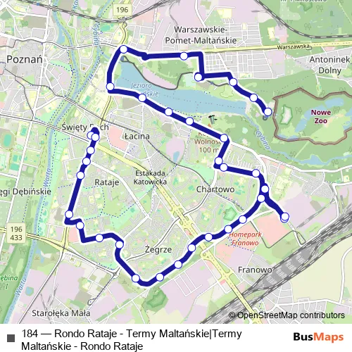 The first stop of the 184 bus route is Rondo Rataje and the last stop is Nowe Zoo. 184 (Rondo Rataje - Termy Maltańskie|Termy Maltańskie - Rondo Rataje) is operational during codziennie.
