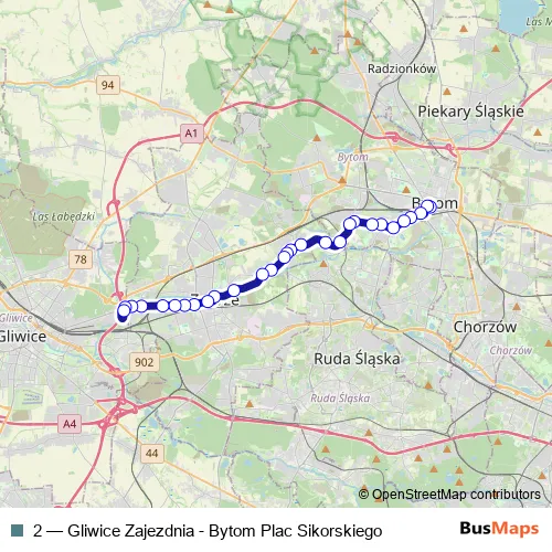The first stop of the 2 tram route is Bytom Plac Sikorskiego and the last stop is Gliwice Zajezdnia Dysp. [tech]. 2 (Gliwice Zajezdnia - Bytom Plac Sikorskiego) is operational during codziennie.