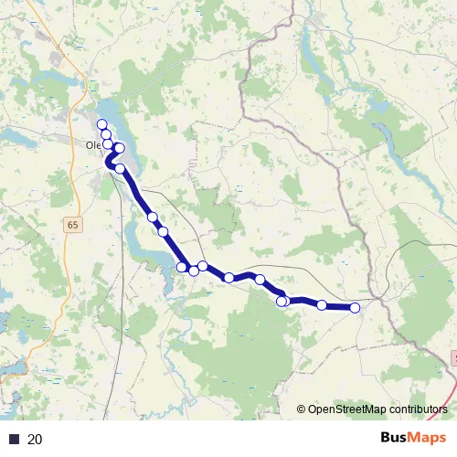 The first stop of the 20 bus route is Cimochy (centrum) - obok stacji paliw and the last stop is Olecko, ul. Gołdapska. 20 is operational during w dni robocze.
