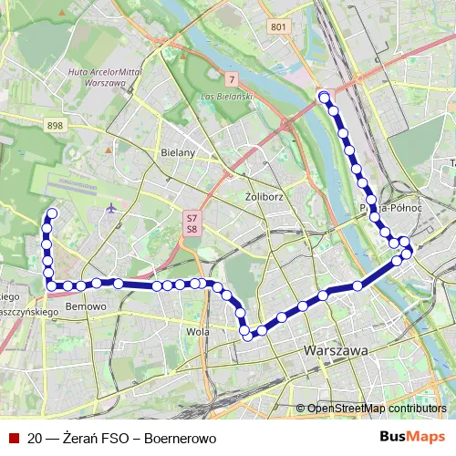 The first stop of the 20 tram route is Żerań Fso and the last stop is Boernerowo. 20 (Żerań FSO – Boernerowo) is operational during codziennie.