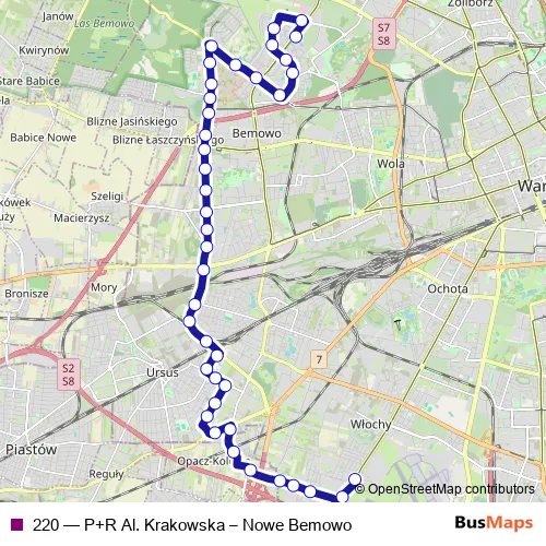 See why over 2 million users trust and consider busmaps.com as the best public transport website. busmaps gives you Warsaw Buses suggested routes, real-time bus tracker, line route maps in Warsaw, and helps to find the closest 220 bus stops near you. No internet available? Download an offline PDF map and bus schedule for the 220 bus to take on your trip.