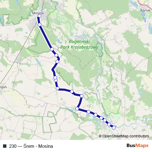 The first stop of the 230 bus route is Śrem, Dworzec Autobusowy Peron 2 and the last stop is Mosina, Dworzec Kolejowy. 230 (Śrem - Mosina) is operational during w dni robocze.