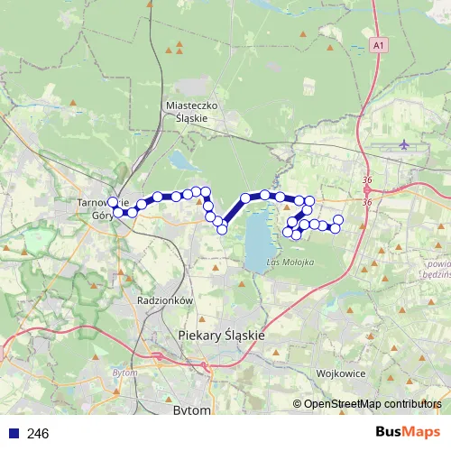 The first stop of the 246 bus route is Sączów Kościół and the last stop is Tarnowskie Góry Dworzec. 246 is operational during w dni robocze.