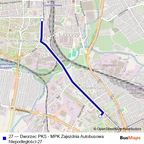 See why over 2 million users trust and consider busmaps.com as the best public transport website. busmaps gives you Czestochowa Buses suggested routes, real-time bus tracker, line route maps in Czestochowa, and helps to find the closest 27 bus stops near you. No internet available? Download an offline PDF map and bus schedule for the 27 bus to take on your trip.