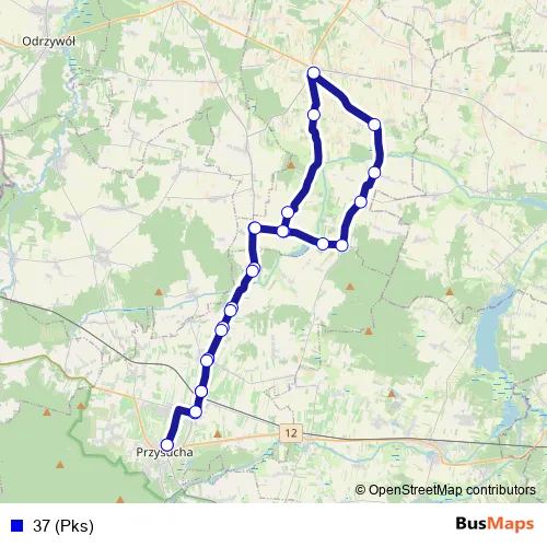 The first stop of the 37 (Pks) bus route is Przysucha, ul. Warszawska / Zpo and the last stop is Przysucha, ul. Warszawska / Zpo. 37 (Pks) is operational during w dni robocze.