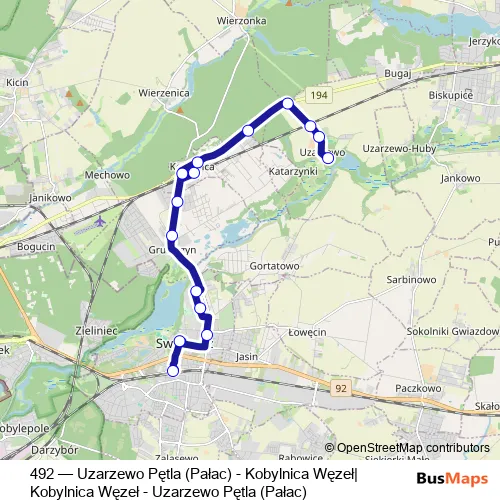 The first stop of the 492 bus route is Swarzędz/Węzeł Przesiadkowy and the last stop is Uzarzewo/Pętla (Pałac). 492 (Uzarzewo Pętla (Pałac) - Kobylnica Węzeł|Kobylnica Węzeł - Uzarzewo Pętla (Pałac)) is operational during w weekendy.