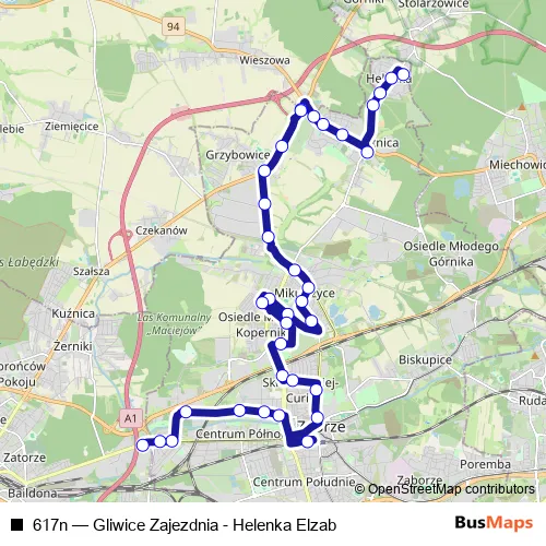 The first stop of the 617n bus route is Helenka Elzab and the last stop is Gliwice Zajezdnia. 617n (Gliwice Zajezdnia - Helenka Elzab) is operational during codziennie.