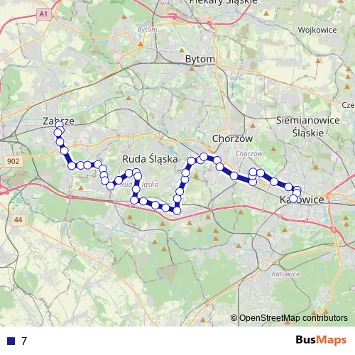 The first stop of the 7 bus route is Zabrze Plac Dworcowy and the last stop is Katowice Plac Wolności. 7 is operational during codziennie.