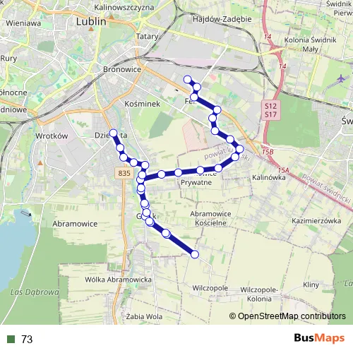 See why over 2 million users trust and consider busmaps.com as the best public transport website. busmaps gives you Lublin Buses suggested routes, real-time bus tracker, line route maps in Lublin, and helps to find the closest 73 bus stops near you. No internet available? Download an offline PDF map and bus schedule for the 73 bus to take on your trip.