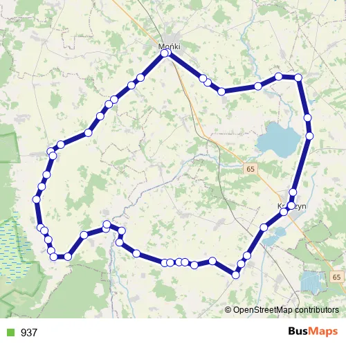 The first stop of the 937 bus route is Knyszyn - Rynek L55 Dw671 and the last stop is Knyszyn, ul. Rynek (Dg). 937 is operational during w dni robocze.