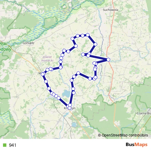 The first stop of the 941 bus route is Jasionówka Rynek L37/P38 Dw671 and the last stop is Jasionówka Rynek L37/P38 Dw671. 941 is operational during w dni robocze.