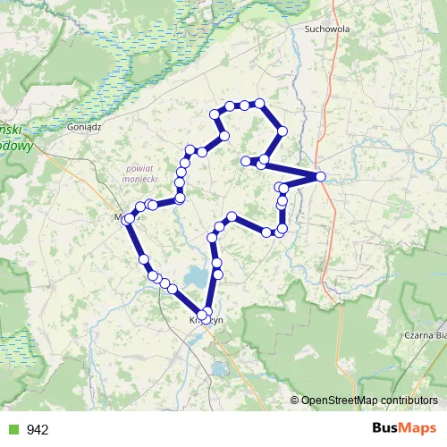 The first stop of the 942 bus route is Jasionówka Rynek L37/P38 Dw671 and the last stop is Jasionówka Rynek L37/P38 Dw671. 942 is operational during w dni robocze.