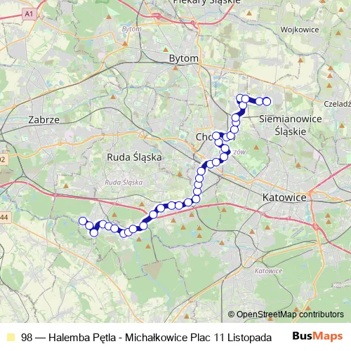 Bus 98 - Halemba Pętla - Michałkowice Plac 11 Listopada: Full Schedule in Swietochlowice