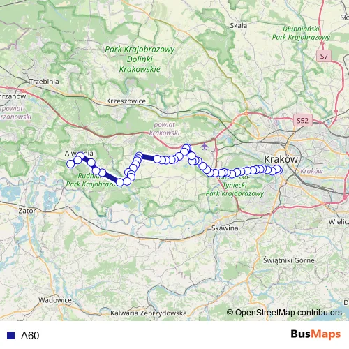 See why over 2 million users trust and consider busmaps.com as the best public transport website. busmaps gives you Krakow Buses suggested routes, real-time bus tracker, line route maps in Krakow, and helps to find the closest A60 bus stops near you. No internet available? Download an offline PDF map and bus schedule for the A60 bus to take on your trip.