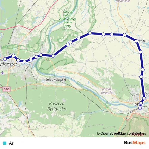 The first stop of the Ar rail route is Bydgoszcz Główna and the last stop is Toruń Główny. Ar is operational during codziennie.