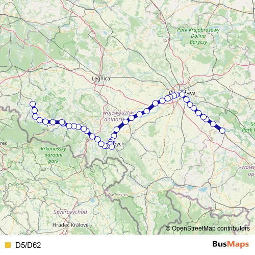 The first stop of the D5/D62 rail route is Brzeg and the last stop is Gryfów Śląski. D5/D62 is operational during w dni robocze.