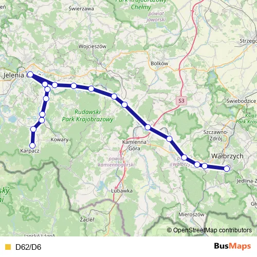 The first stop of the D62/D6 rail route is Karpacz and the last stop is Wałbrzych Główny. D62/D6 is operational during codziennie.
