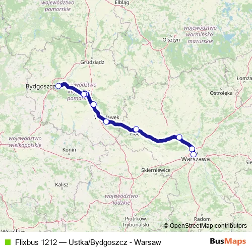 The first stop of the Flixbus 1212 bus route is Warsaw, Bus Station West and the last stop is Bydgoszcz, Bus station. Flixbus 1212 (Ustka/Bydgoszcz - Warsaw) is operational during codziennie.