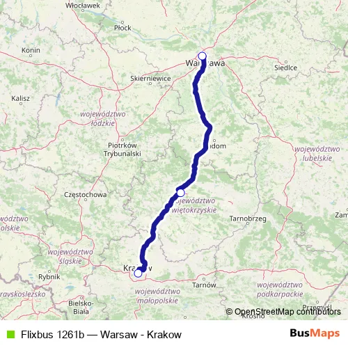 The first stop of the Flixbus 1261b bus route is Krakow, MDA Bus Station and the last stop is Warsaw, Bus Station West. Flixbus 1261b (Warsaw - Krakow) is operational during codziennie.