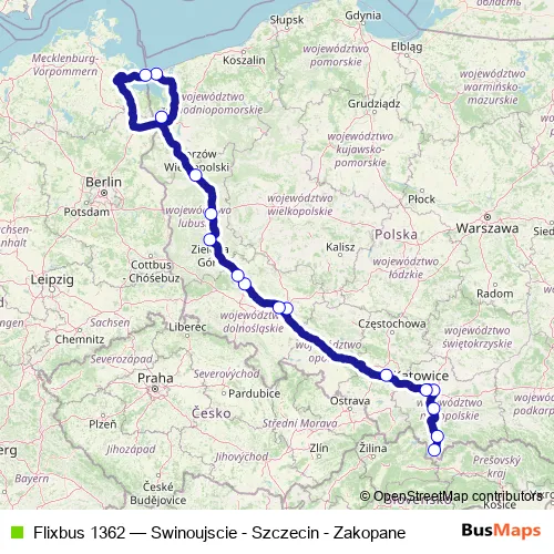 The first stop of the Flixbus 1362 bus route is Zakopane, Bus station and the last stop is Szczecin, Bus Station. Flixbus 1362 (Swinoujscie - Szczecin - Zakopane) is operational during codziennie.