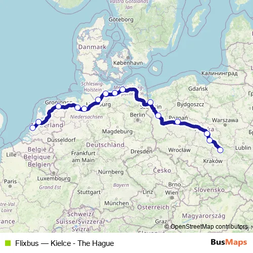 The first stop of the Flixbus bus route is Kielce Dworzec Autobusowy and the last stop is The Hague Rijnstraat. Flixbus (Kielce - The Hague) is operational during codziennie.
