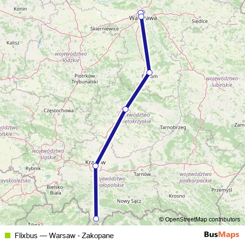 The first stop of the Flixbus bus route is Warszawa Bus Station and the last stop is Zakopane Bus Station. Flixbus (Warsaw - Zakopane) is operational during codziennie.